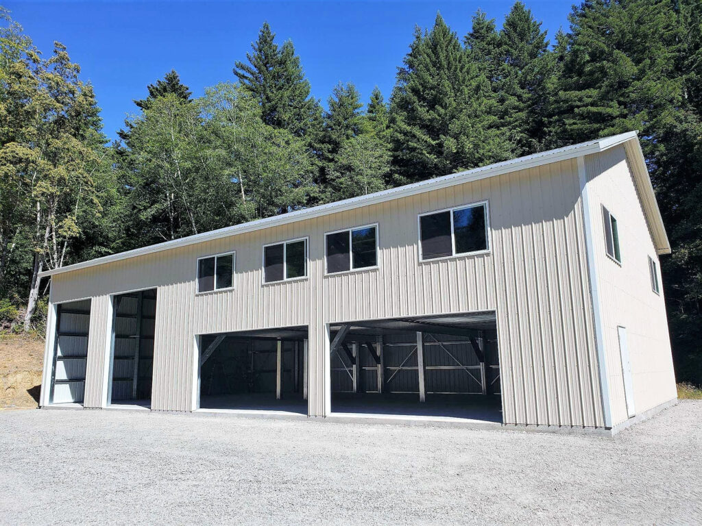 This gable with two roll up doors and an open leanto is suitable for commercial, agricultural, and other applications.